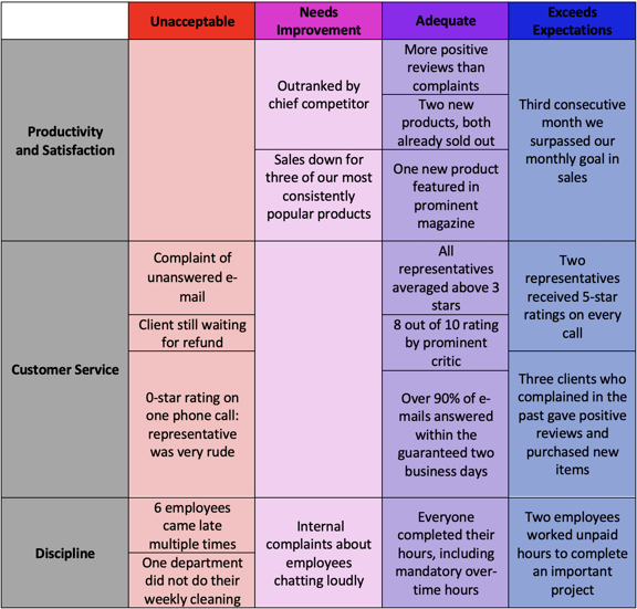 The chart divides information into three main categories: Sales, Customer Service, and Productivity and Satisfaction. It further separates them by performance level: Exceeds Expectations, Adequate, Needs Improvement, and Unacceptable. To interpret the data accurately, we must note not only how many details appear in each column, but also how they connect across categories.
