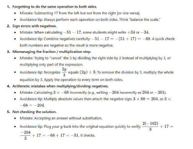 “Remember: solve one inverse operation at a time, keep the equation balanced by doing the same thing to both sides, watch your negative signs, and always check your answer by substituting it back into the original equation.”