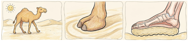 Answer (A) is correct because wide feet spread the camel’s heavy weight over a larger area. Think of it like snowshoes: if you step on soft snow with a small shoe, you sink in. But if you wear a wide snowshoe, your weight is spread out and you stay on top. The same idea works on sand. Wide feet keep the camel from sinking.