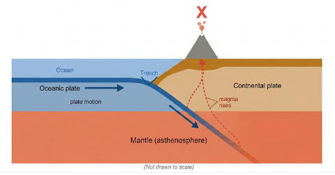 The diagram below shows a cross-section of two tectonic plates at a convergent boundary. The denser oceanic plate is being pushed beneath the less dense continental plate in a process called subduction. As the oceanic plate sinks deeper into the mantle, it melts and produces magma that rises toward the surface.