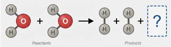 A student passes an electric current through water to break it apart into simpler substances. This process is called electrolysis. The ball-and-stick model below shows the reactant molecules on the left side of the arrow and the product molecules on the right side. One product molecule is missing from the equation.