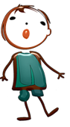 Answer (D) is incorrect because the character in this picture is wearing a green shirt and green pants.