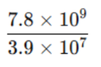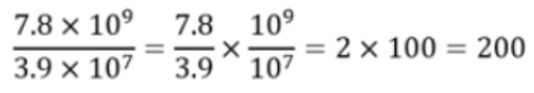 Do not forget that the decimal number before the exponent in the world population number is also twice as high as the California number, so it also needs to be multiplied by two: 2 × 100 = 200.