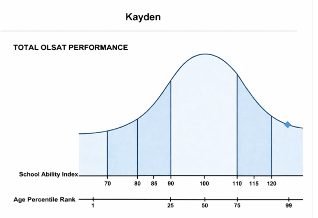 Kayden demonstrates exceptional school ability across both verbal and nonverbal domains. His scores would typically be reviewed for placement in Gifted & Talented programs, which is one of the stated intended uses of the OLSAT 8. His one area of relative (not absolute) weakness is Figural Reasoning, which could be enriched through puzzles, spatial reasoning games, and geometry activities.