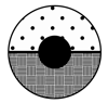 All figures in the matrix are made from the same basic shape: a circle with two halves and an inner circle. The solution lies in identifying three distinct color patterns.
