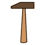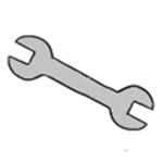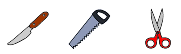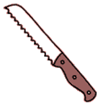 Look at the top row. All the items in the top row can cut. The correct answer should be a similar item. The hammer and the wrench cannot be used for cutting, so they are not correct answers. We are left with the bread knife as the best possible answer. Therefore, it is the correct choice.