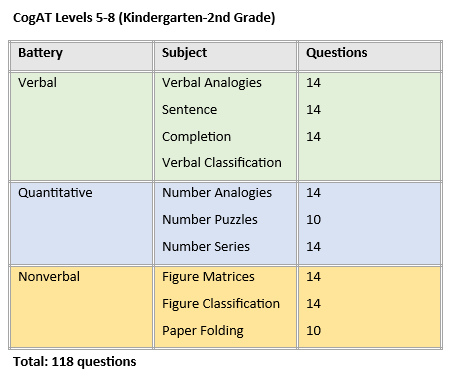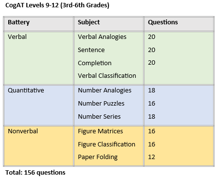 Each CogAT level contains 9 subtests. The number of questions varies by age.
